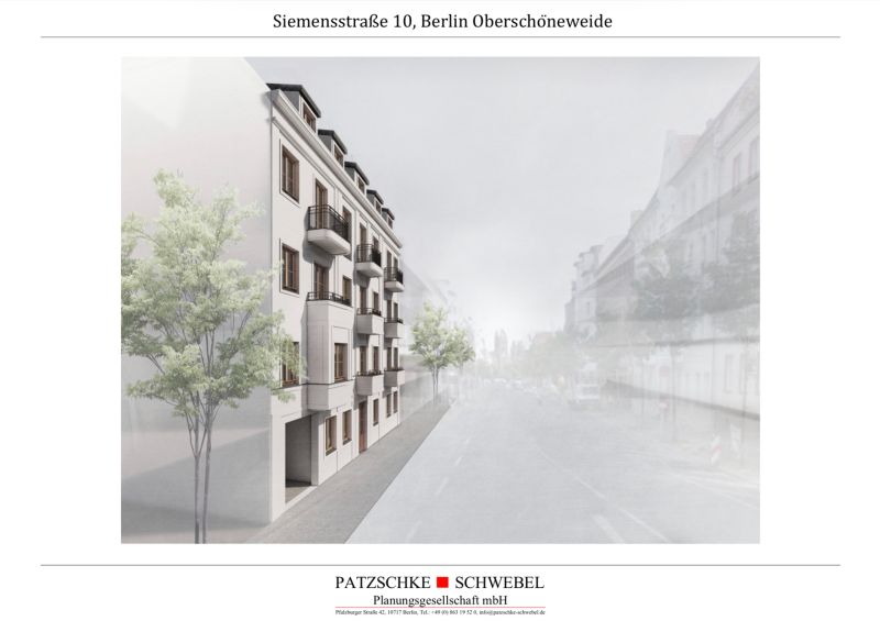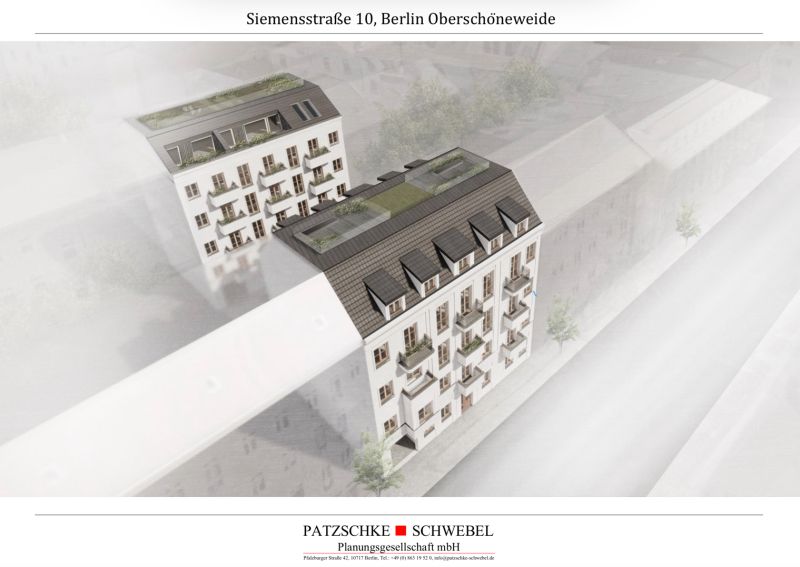 Die Patzschke & Patzschke Group GmbH und die Fenner Group GmbH entwickeln gemeinsam ein Grundstück in Oberschöneweide. Durch die zweigeschossige Aufstockung des Vorderhauses und einen Neubau in zweiter Reihe entstehen neue Wohnungen sowie eine Tech-WG mit 45 WG-Zimmern. Baubeginn ist für den Frühling/Sommer 2022 geplant.