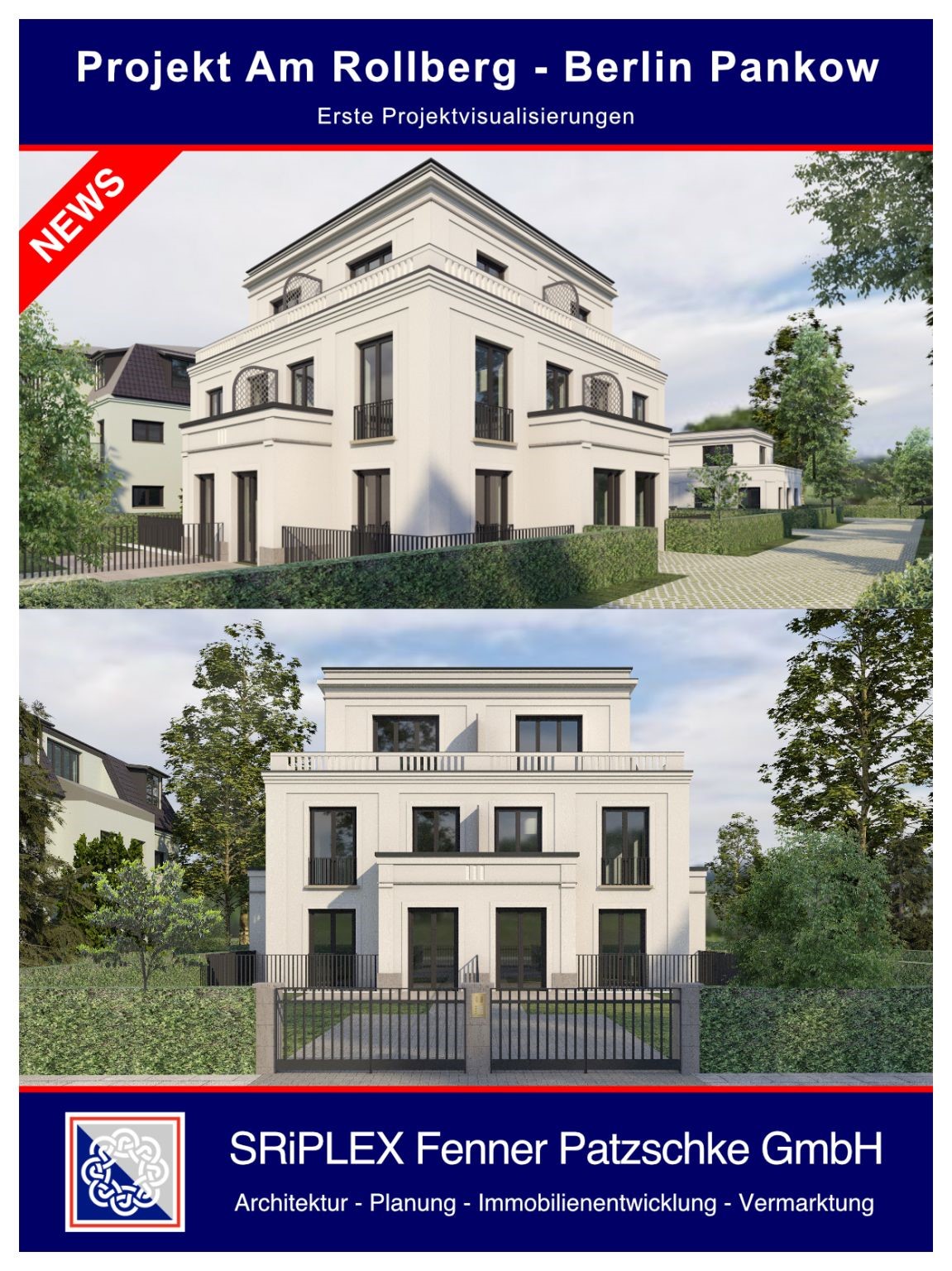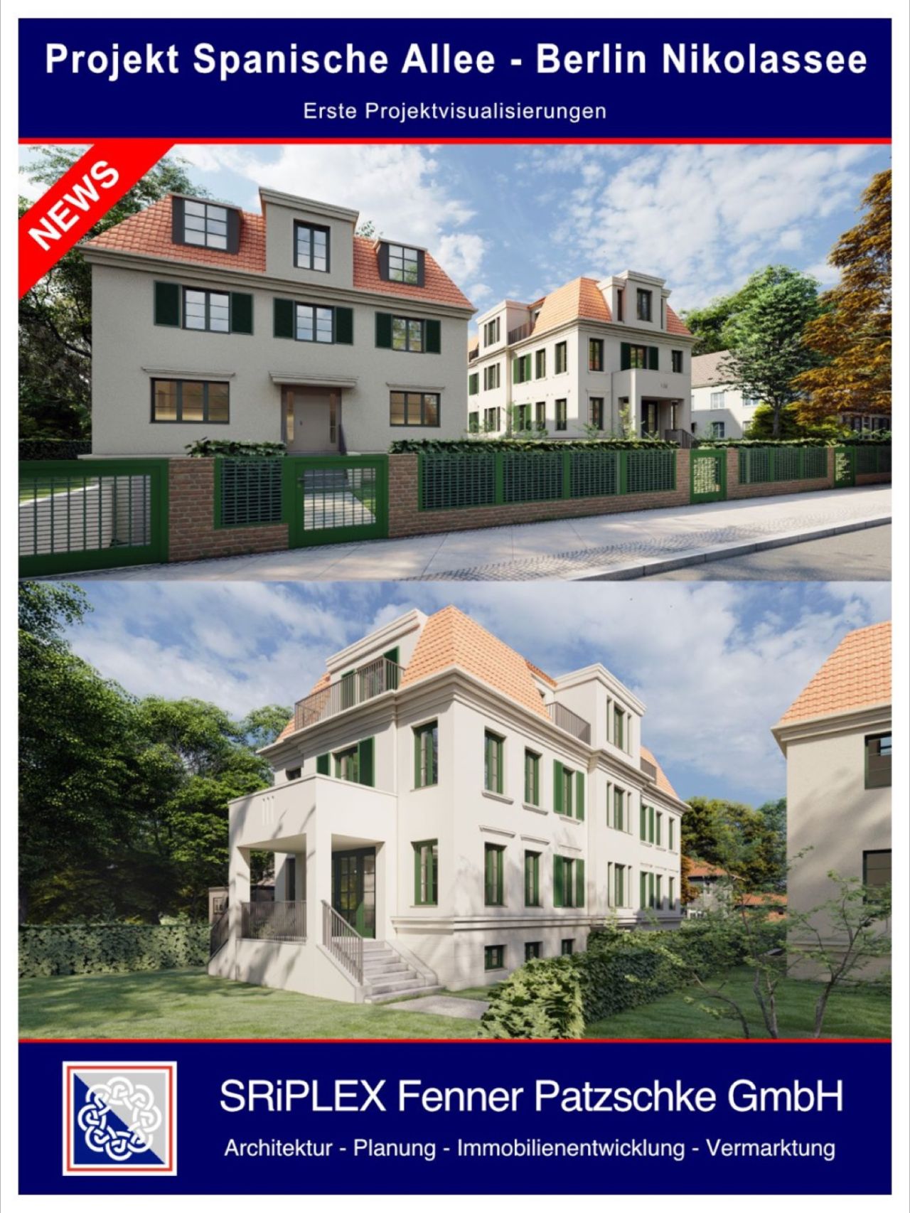 Mit unserer SRiPLEX Fenner Patzschke GmbH entwickeln wir das erste nachhaltig angelegte Immobilienprojekt. Ab 2023 entsteht dadurch in Berlin-Nikolassee ein hochwertiges Villen-Ensemble für individuelle Lebensqualität in bester Berliner Lage.